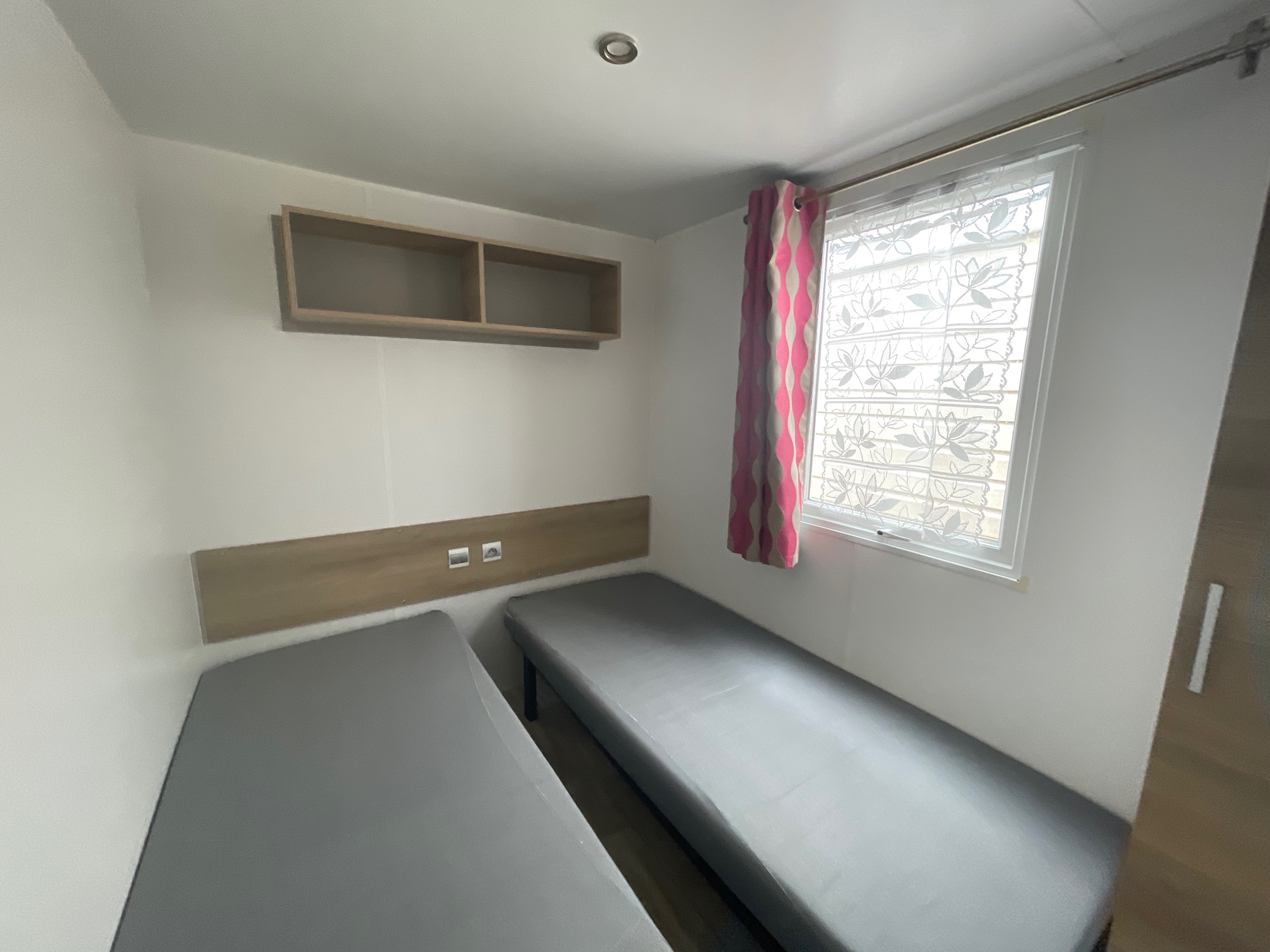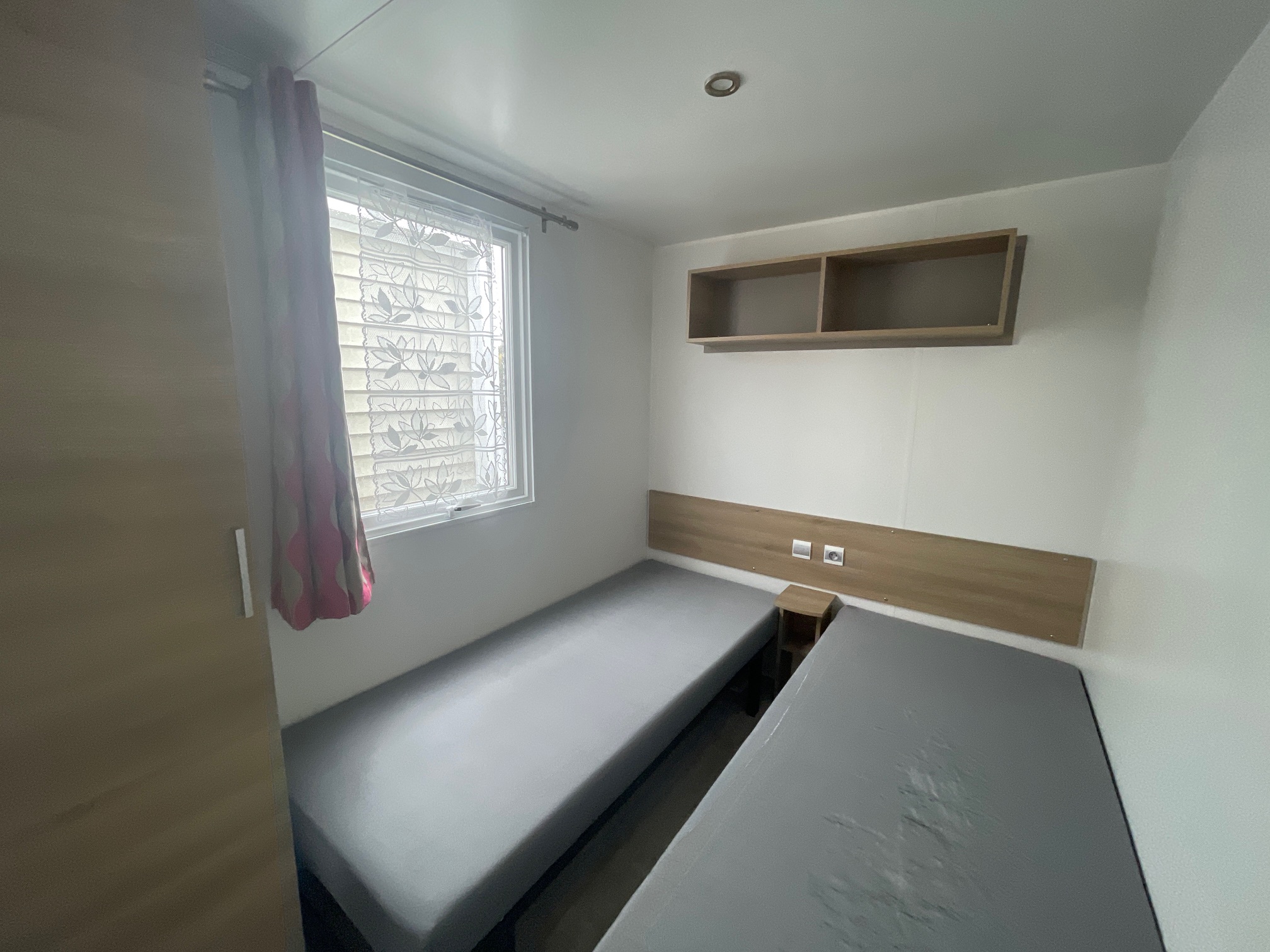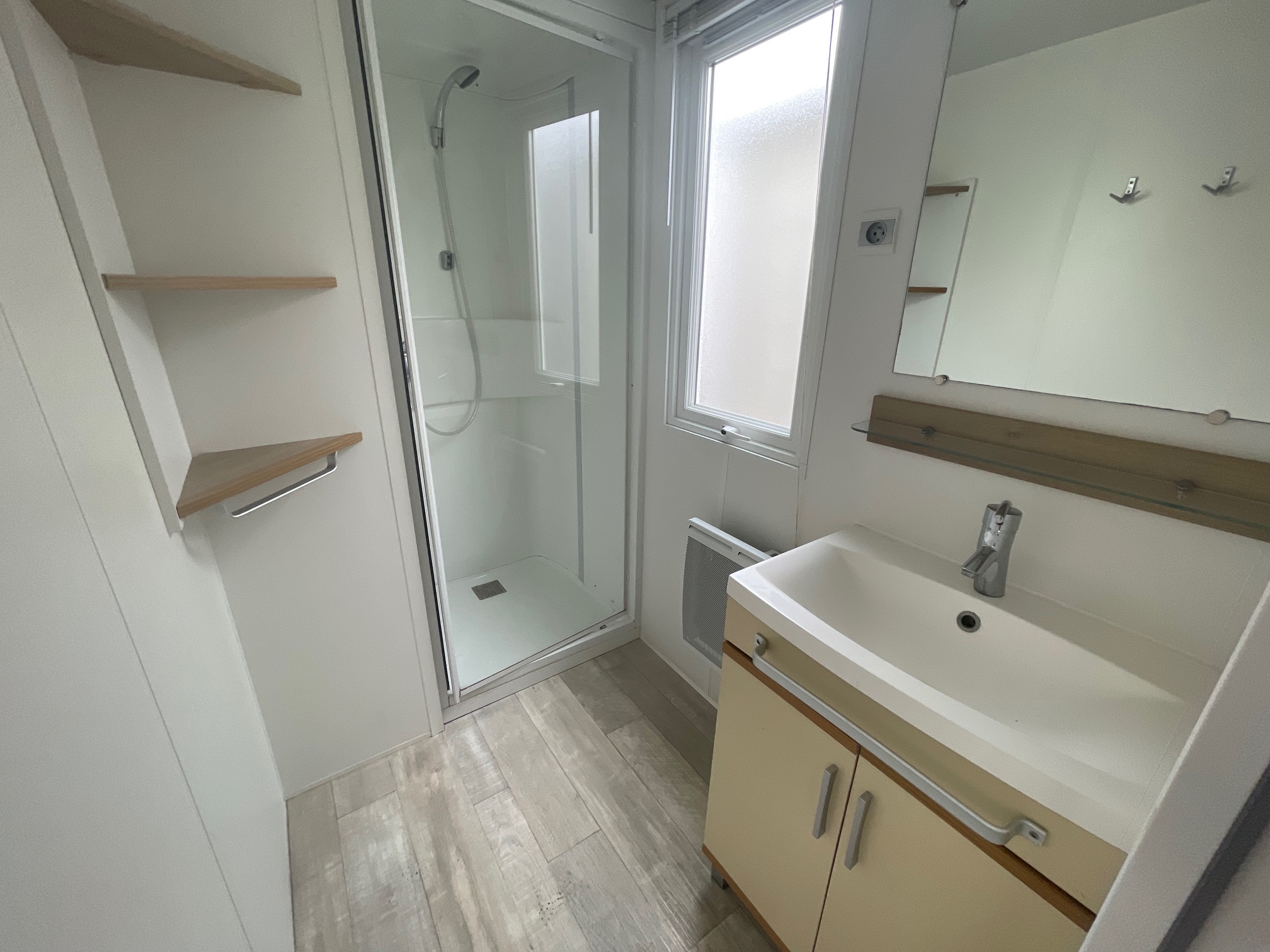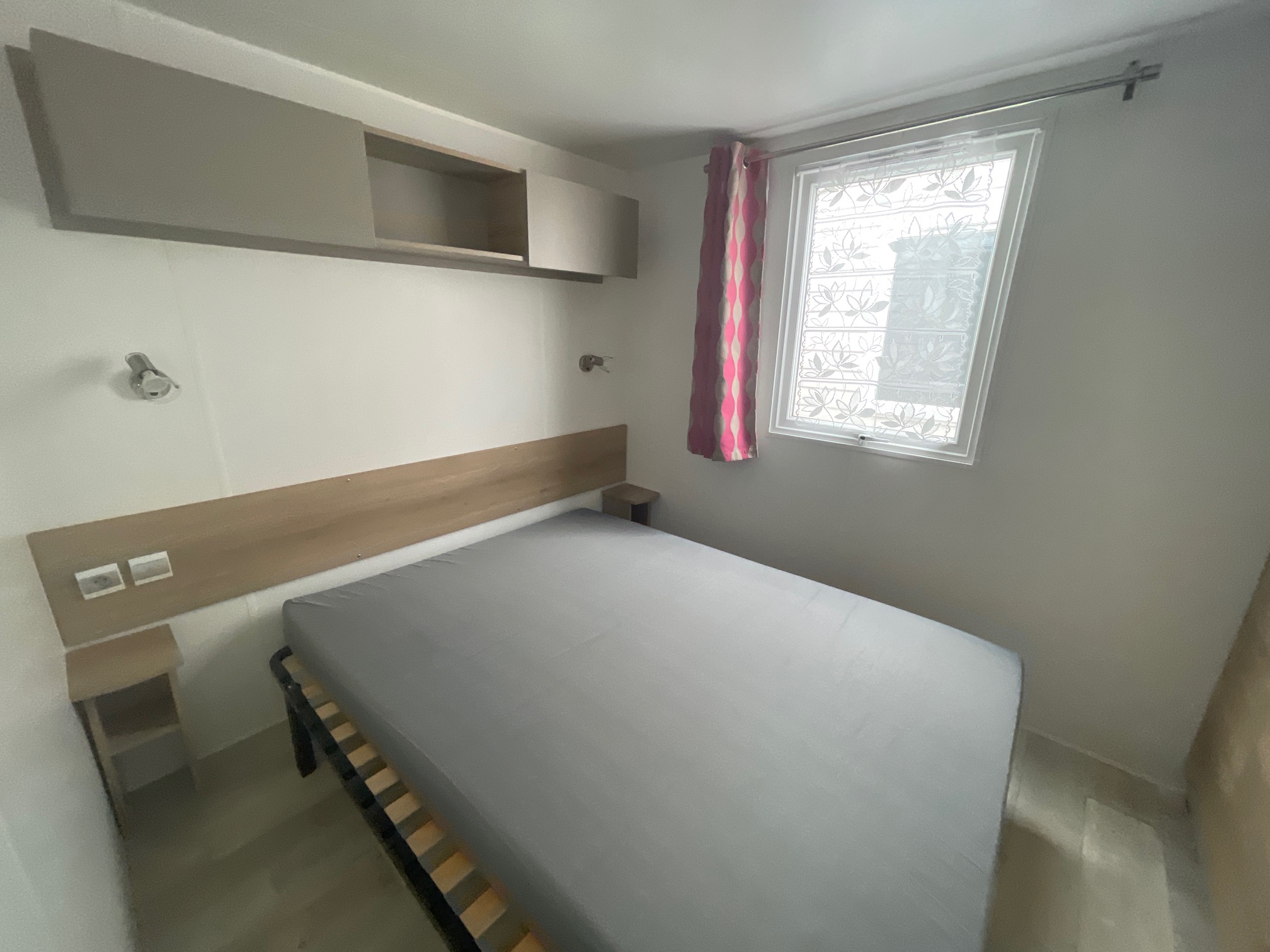 Mobil home d’occasion IRM ELEGANZIA, d’année 2015, toit double pente tuilé, bardage PVC, simple vitrage, 8.80x4m soit 35m² et 3 chambres.
