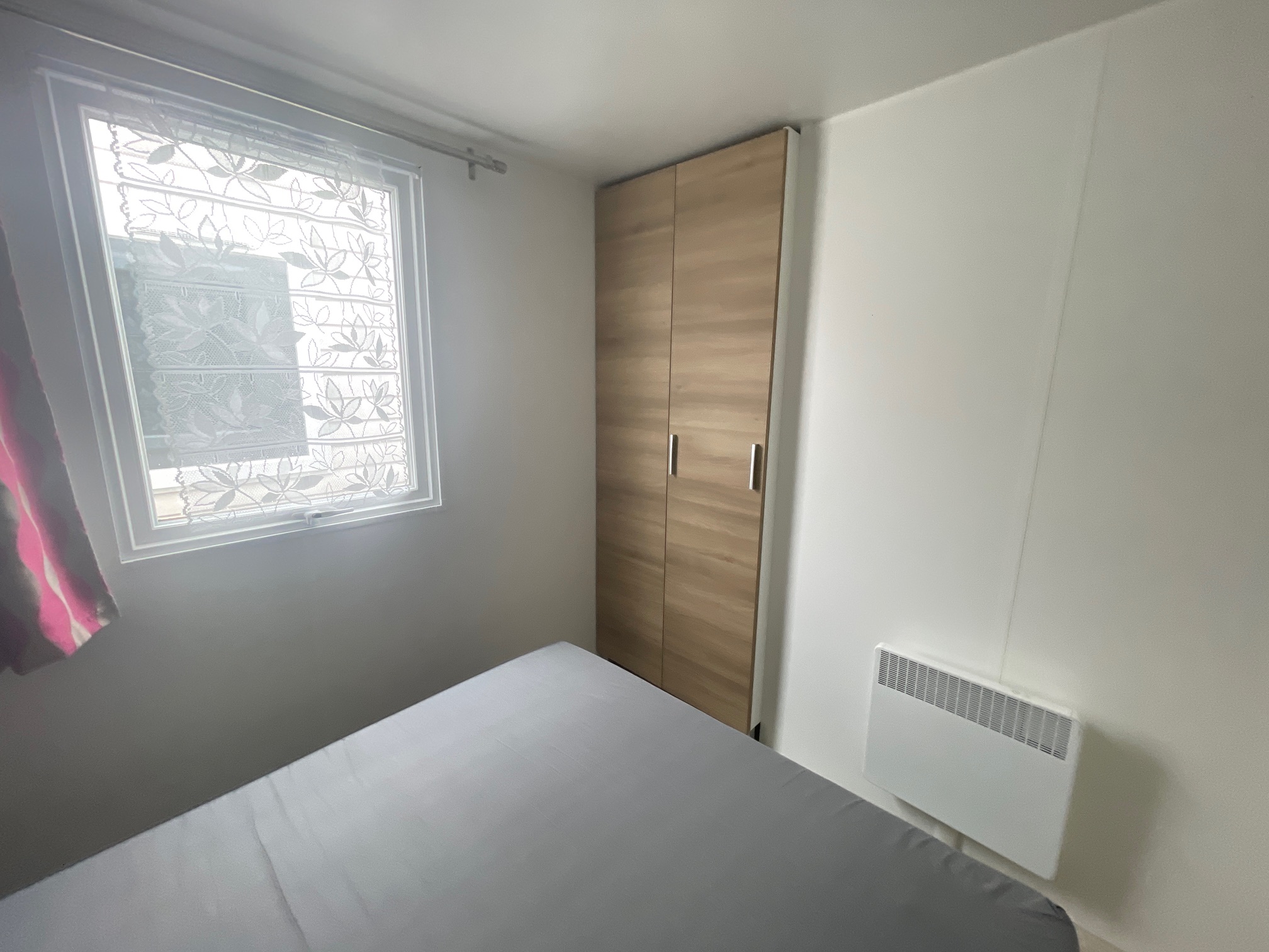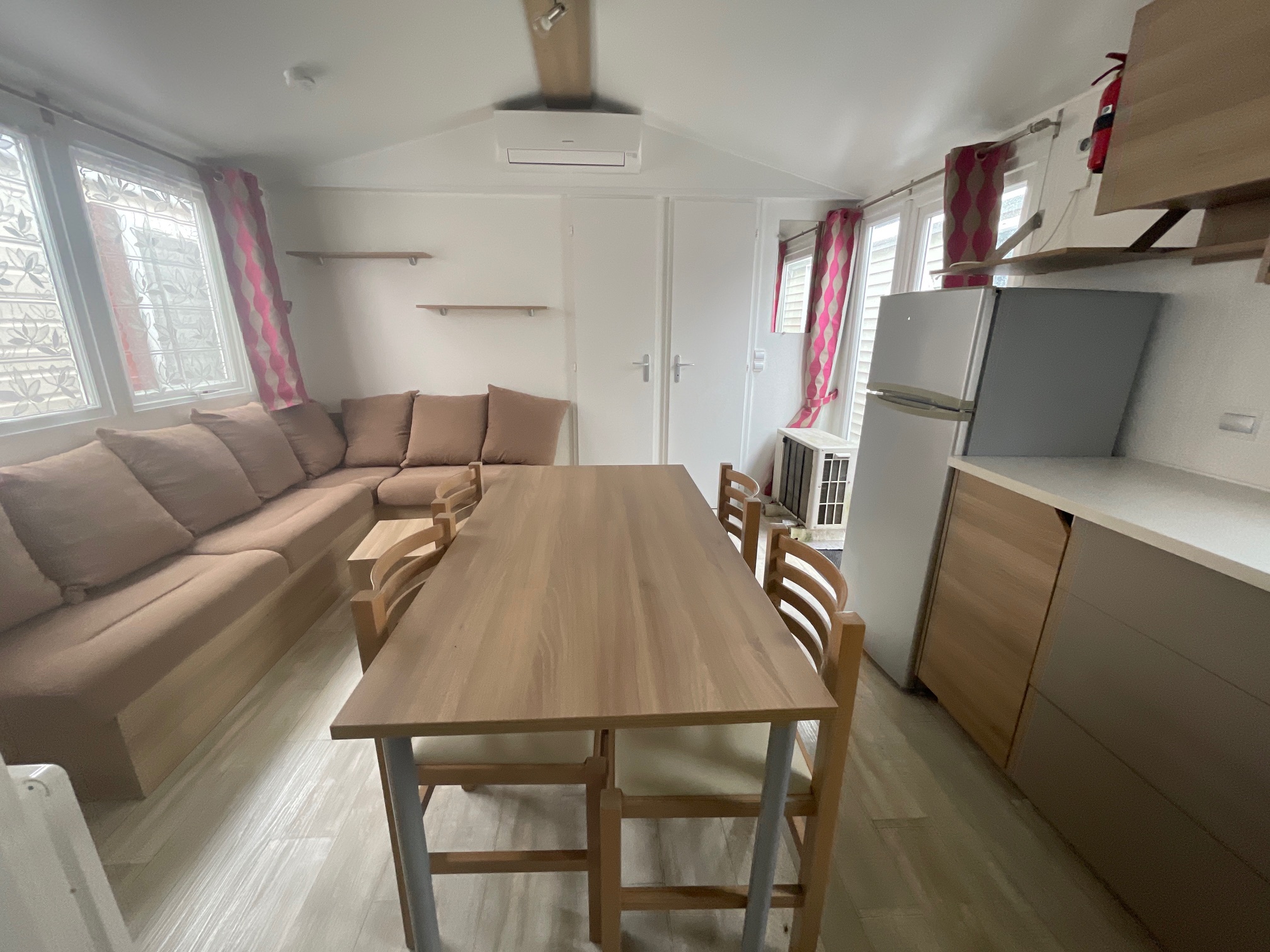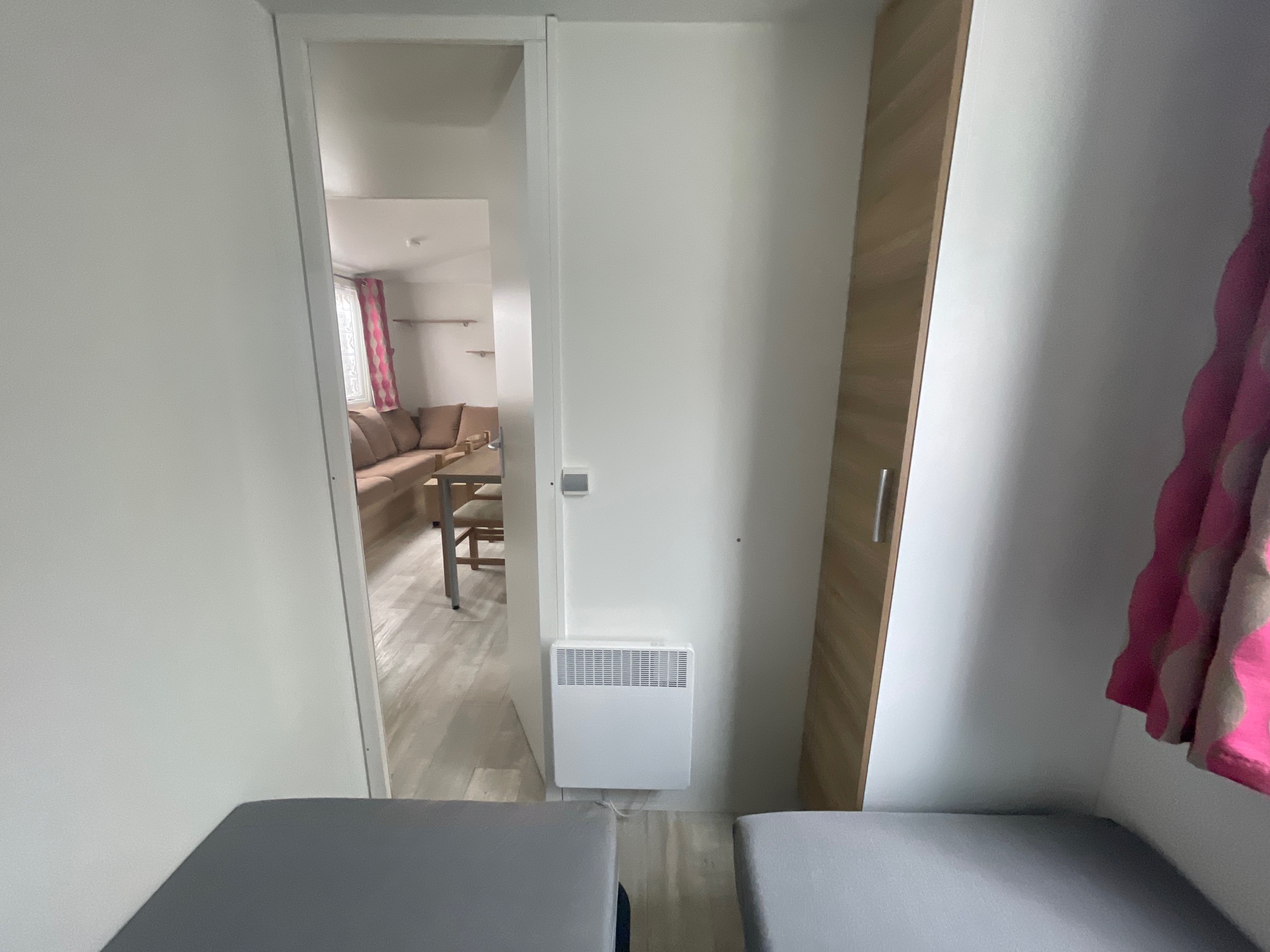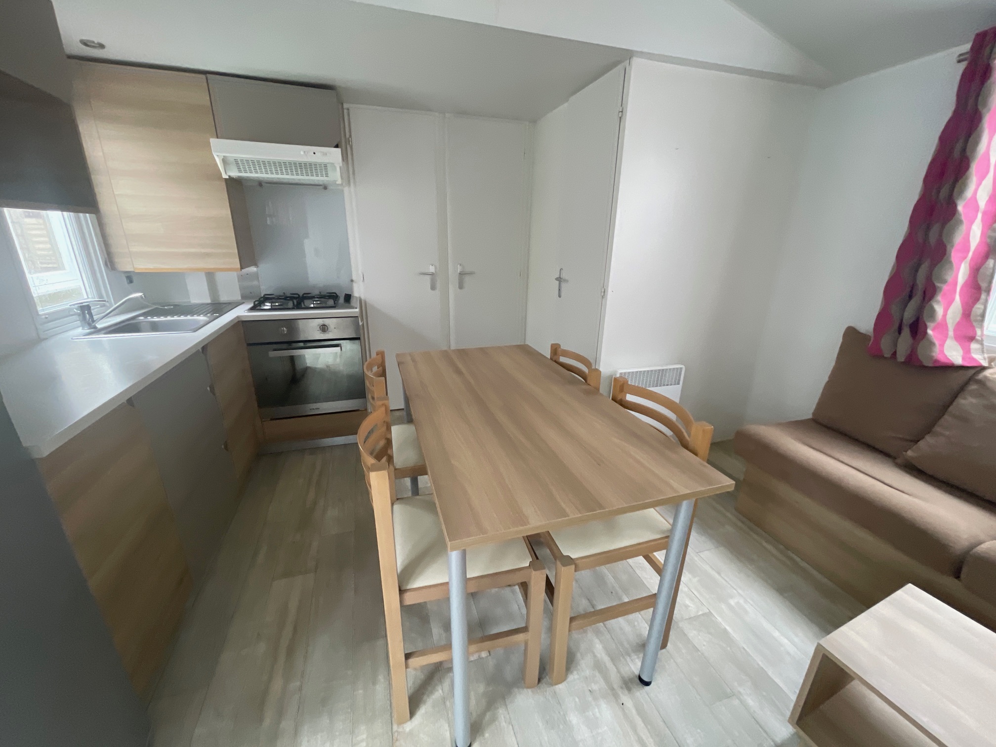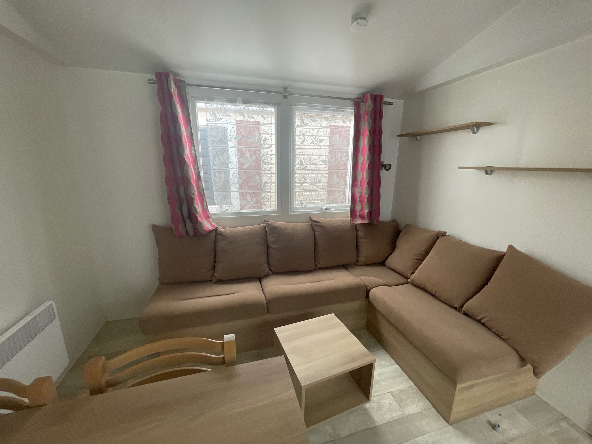 Mobil home d’occasion IRM ELEGANZIA, d’année 2015, toit double pente tuilé, bardage PVC, simple vitrage, 8.80x4m soit 35m² et 3 chambres.