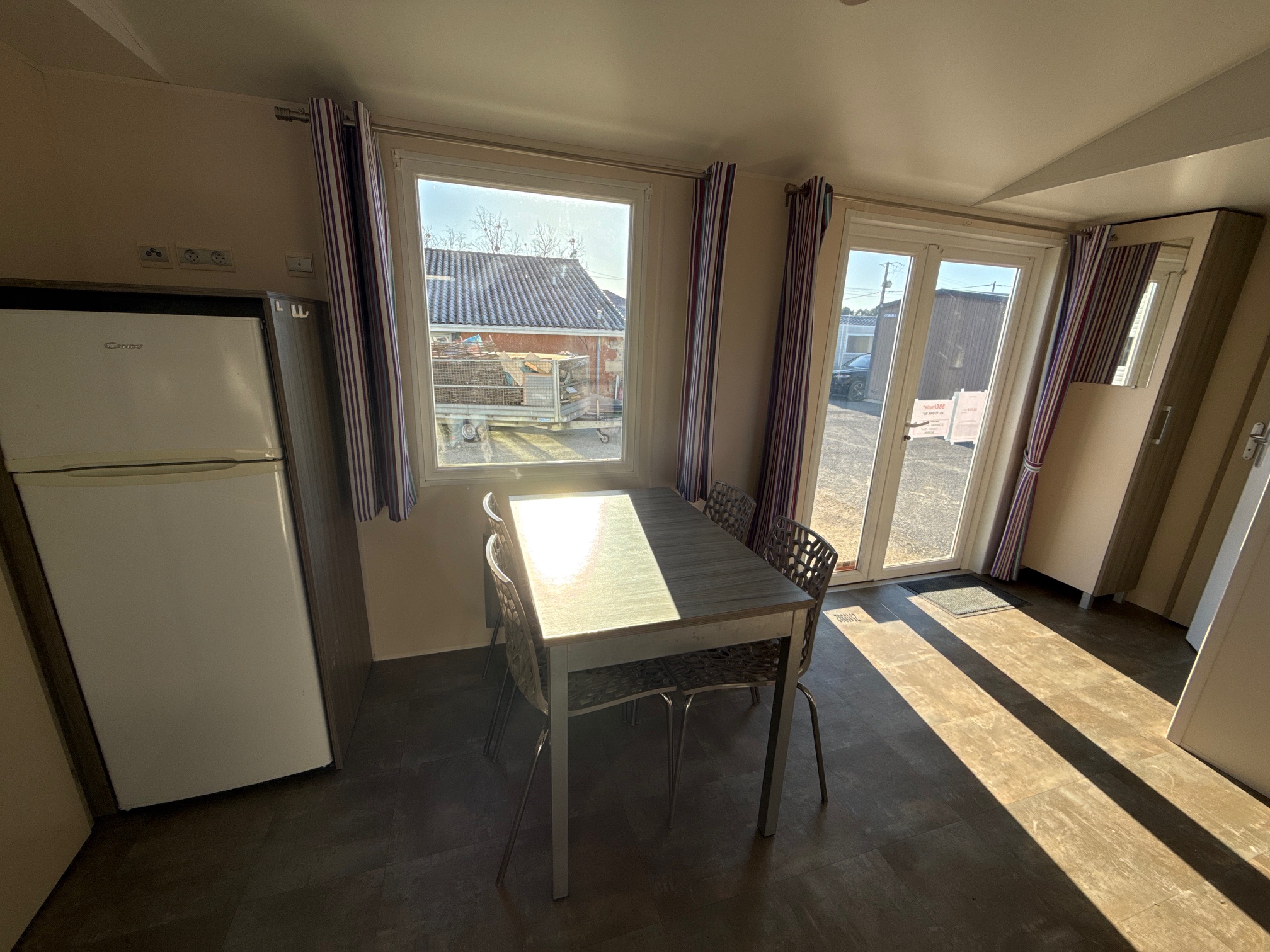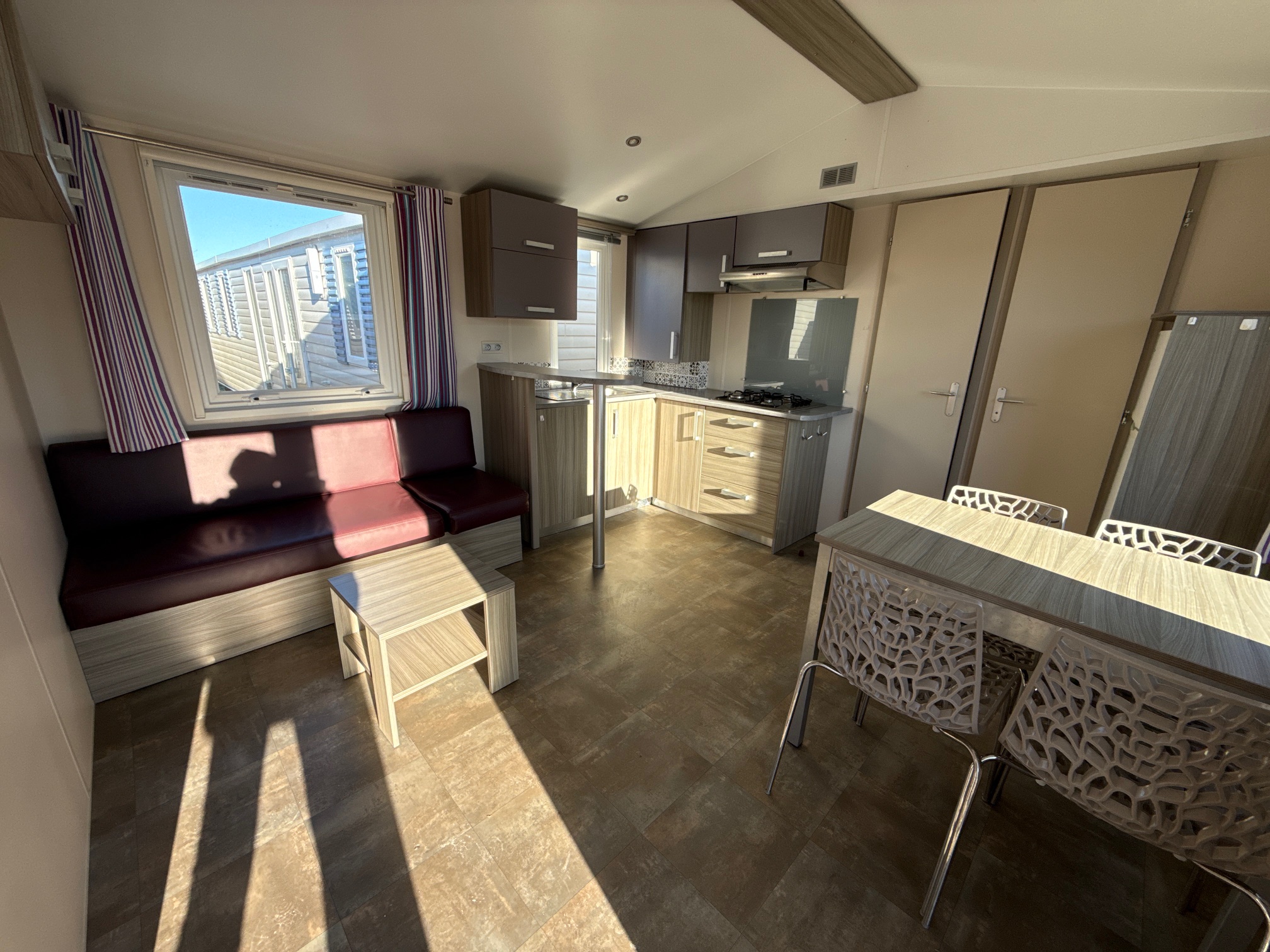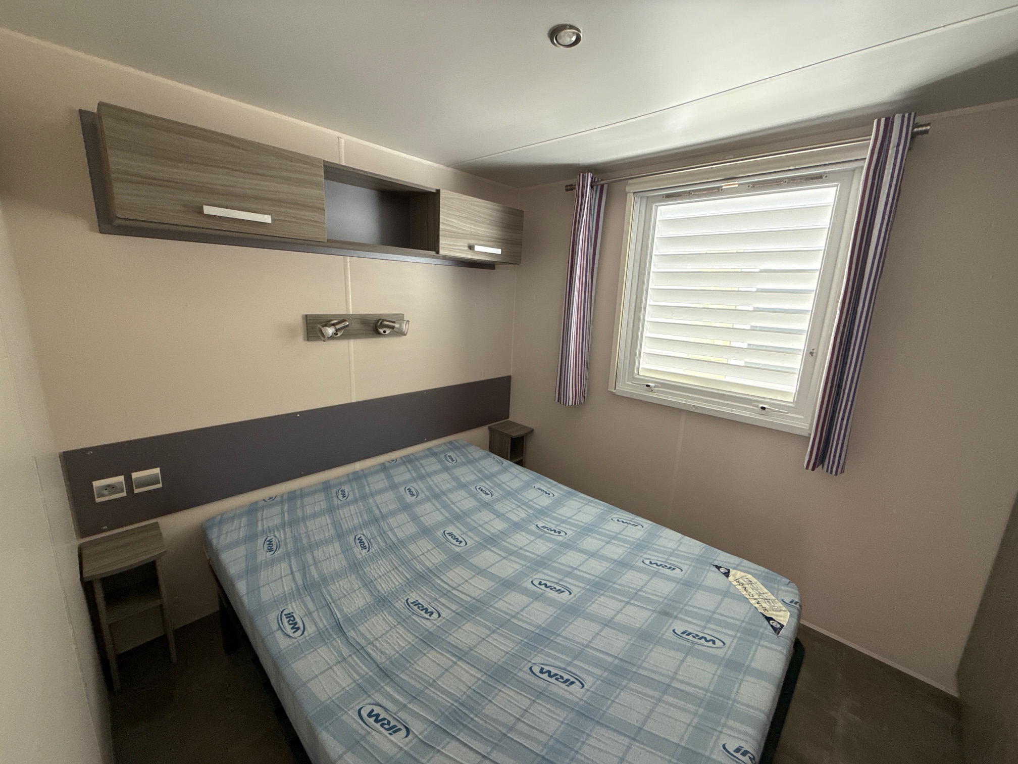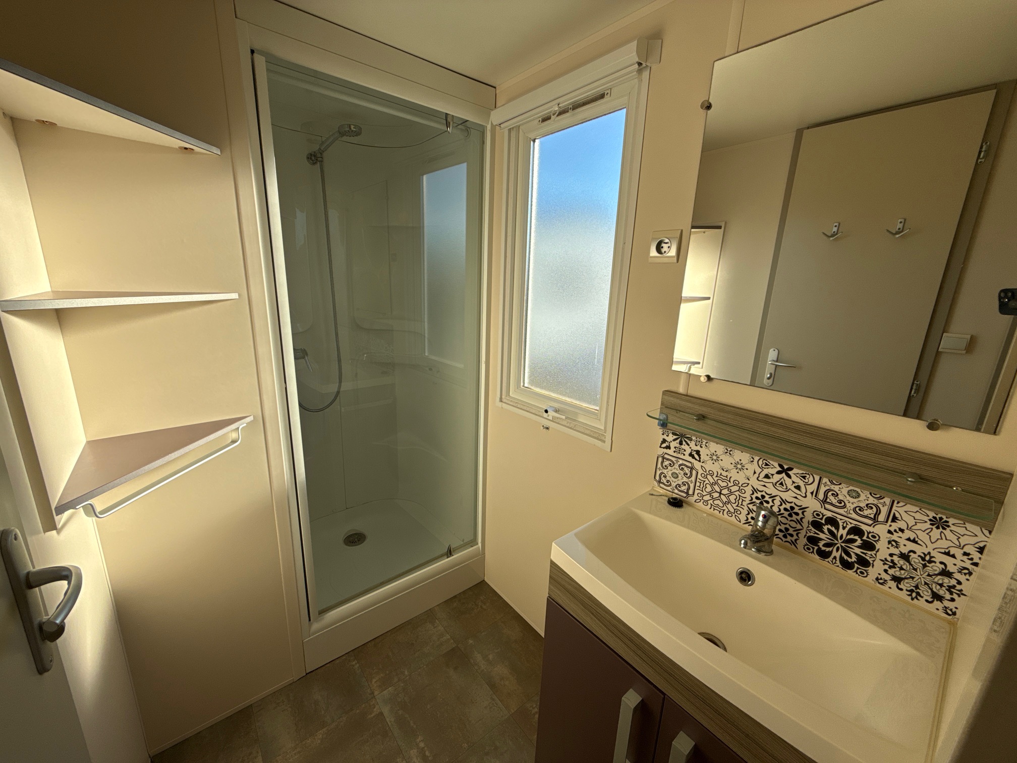 Mobil home d’occasion IRM SUPER TITANIA, d’année 2011, 7.90x4m soit 31m², toit double pente tuilé, bardage PVC et double vitrage, 2 chambres.