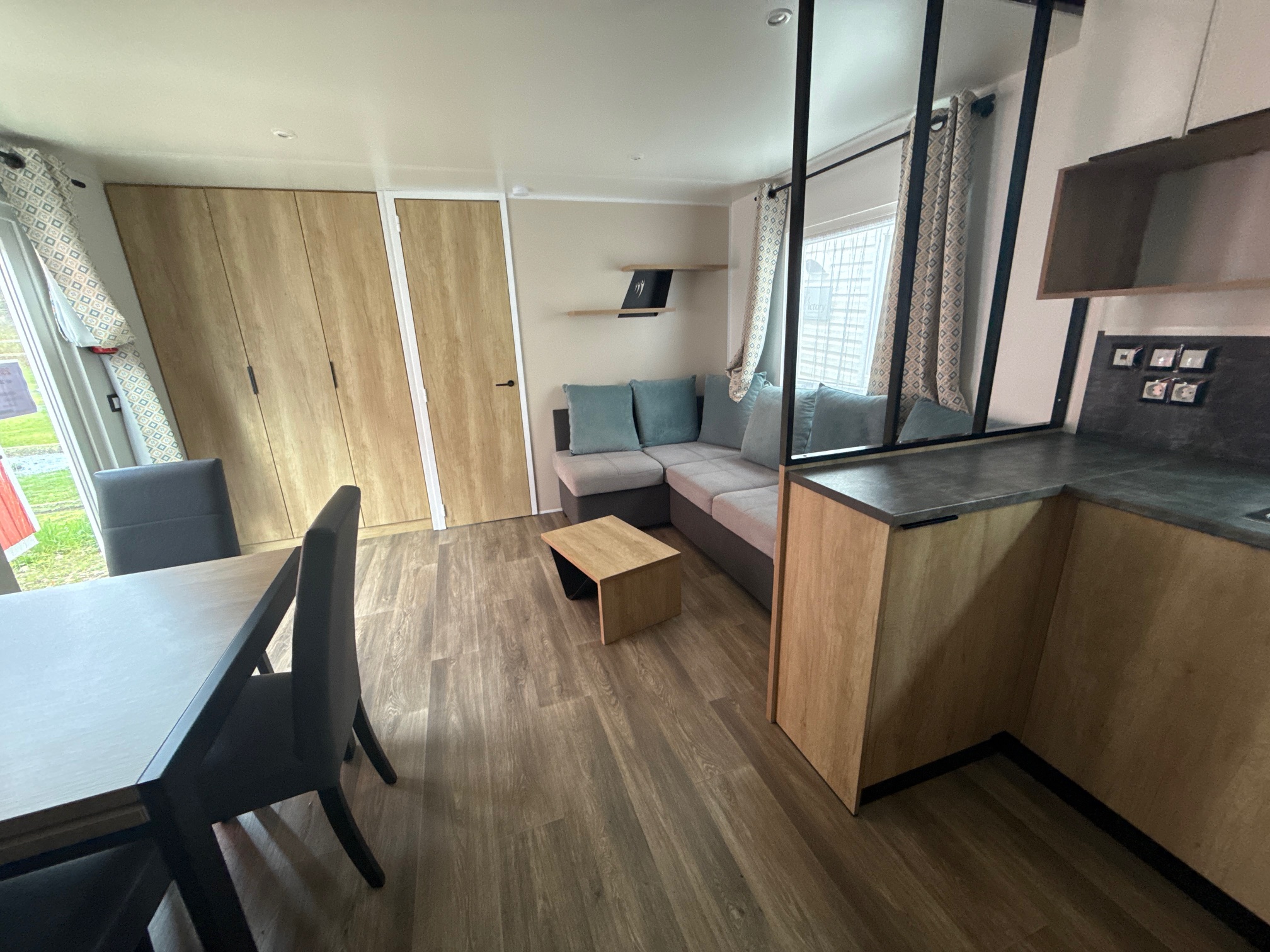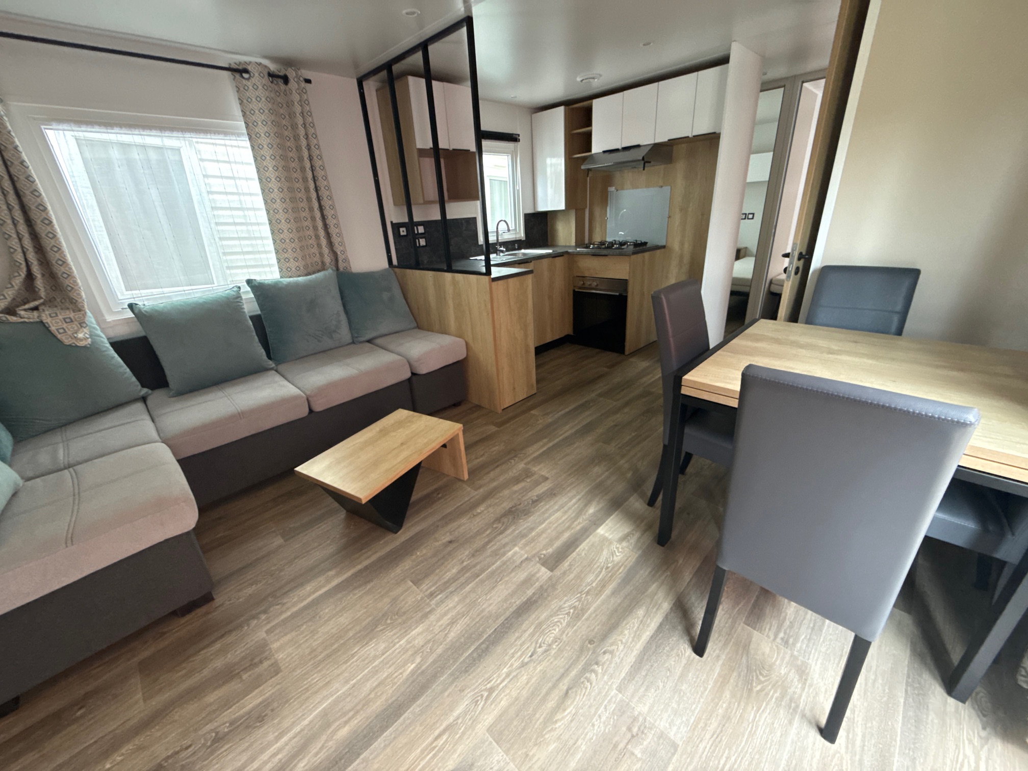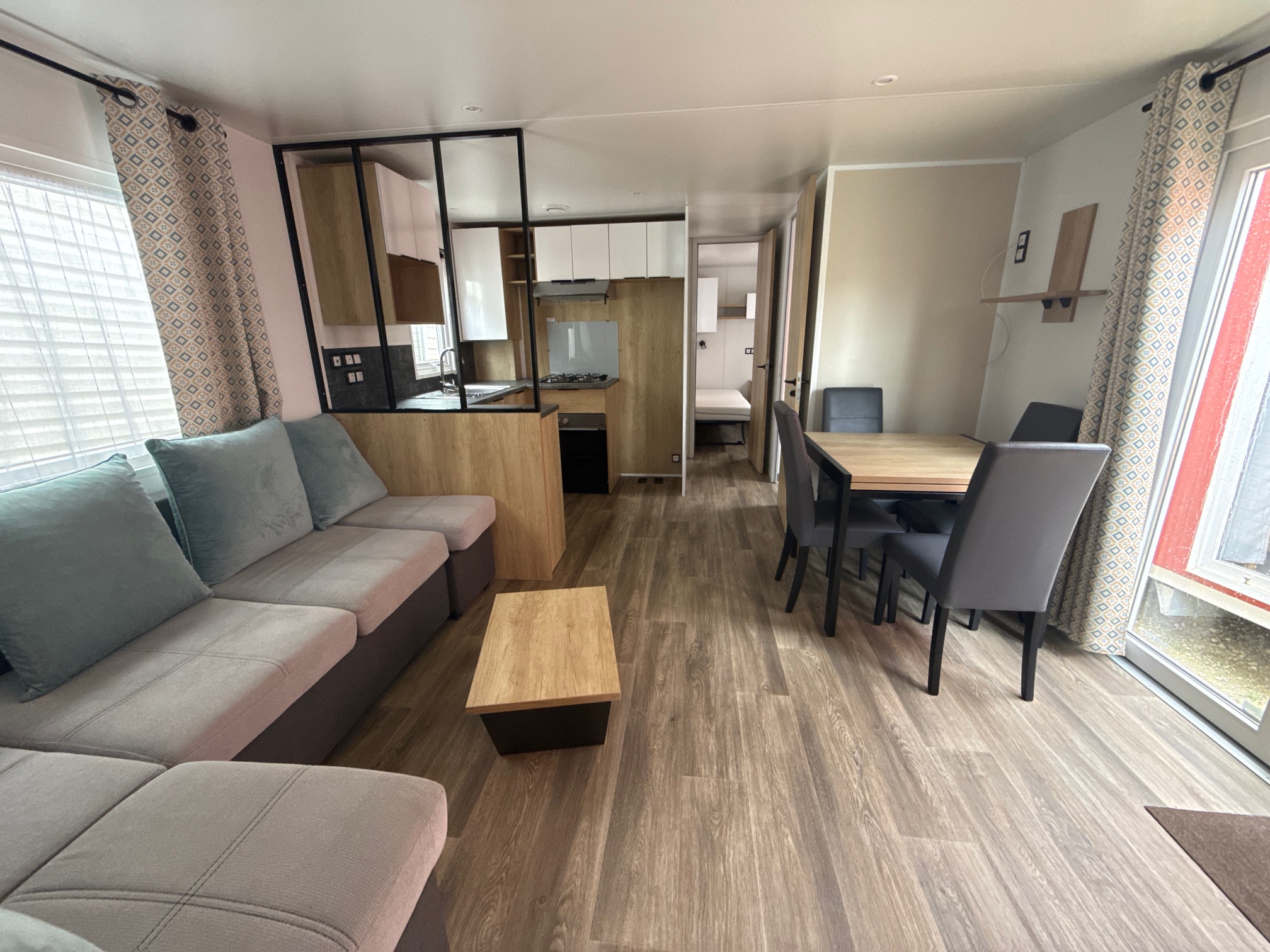 Ce mobil home d’occasion RAPIDHOME BORA BORA, vous séduira par sa belle pièce de vie, ses 3 chambres mais également par son grand dressing dans la chambre parents.