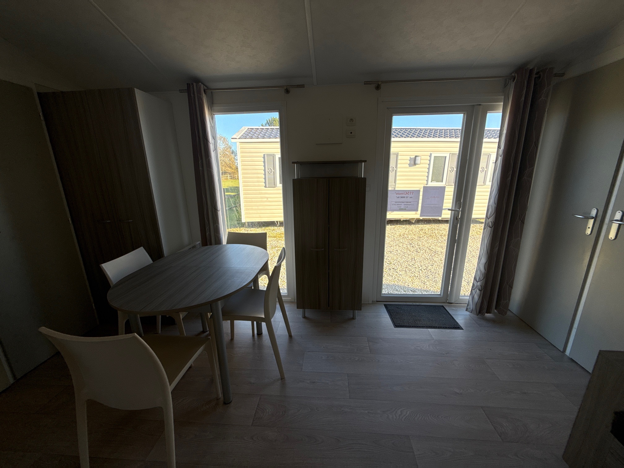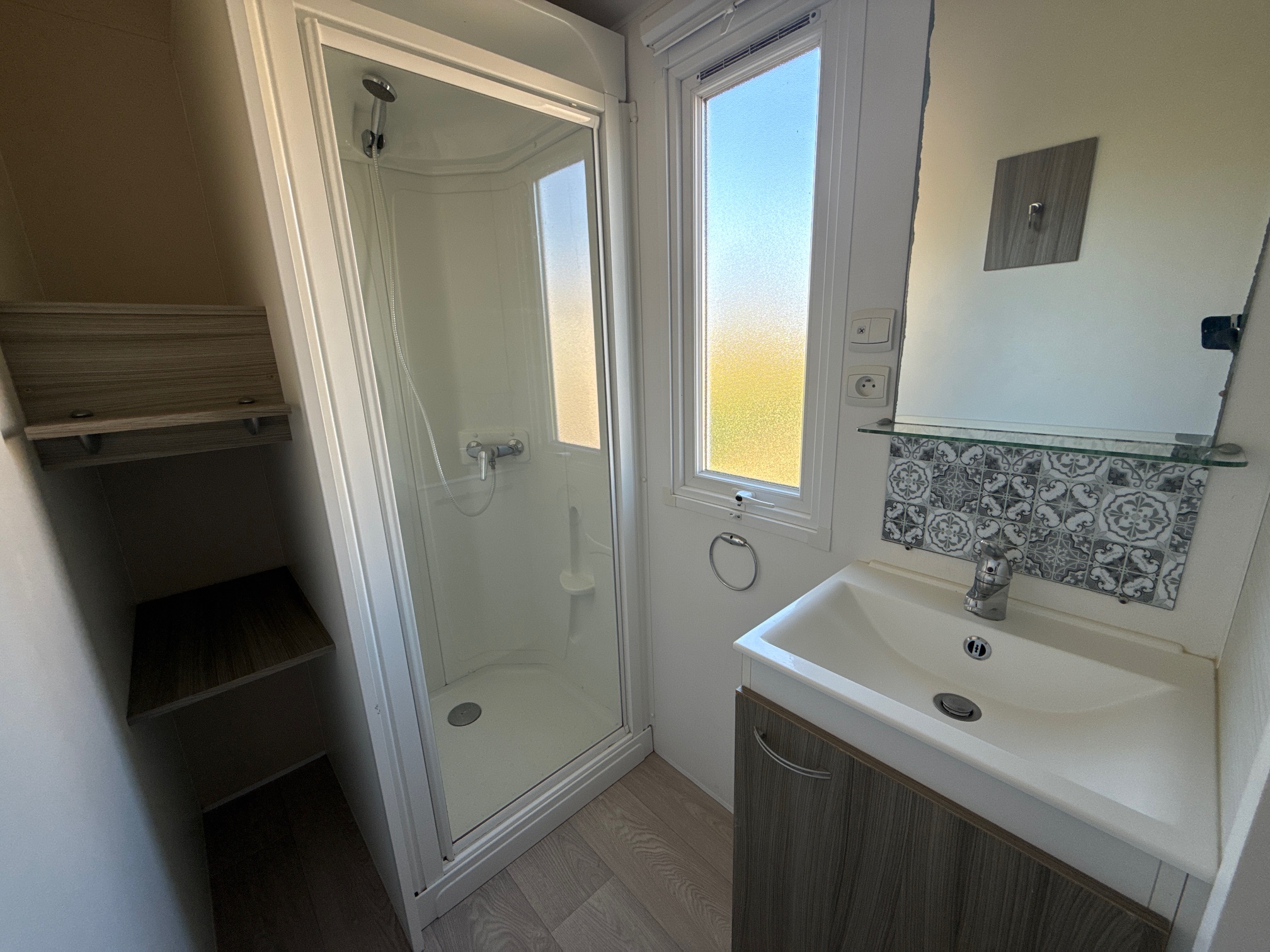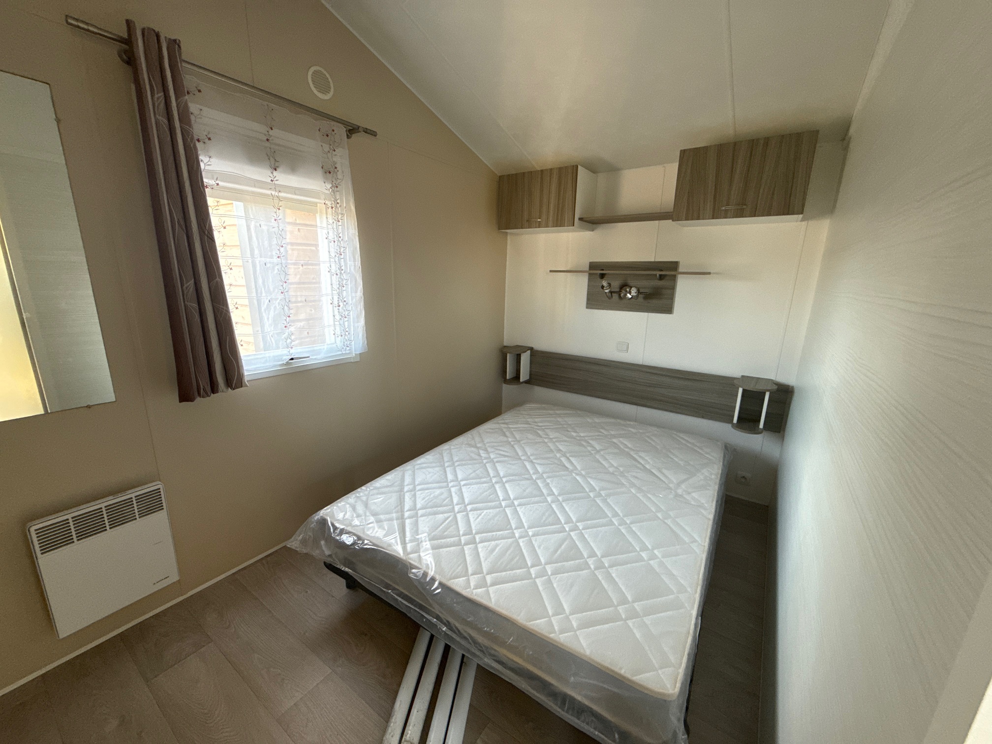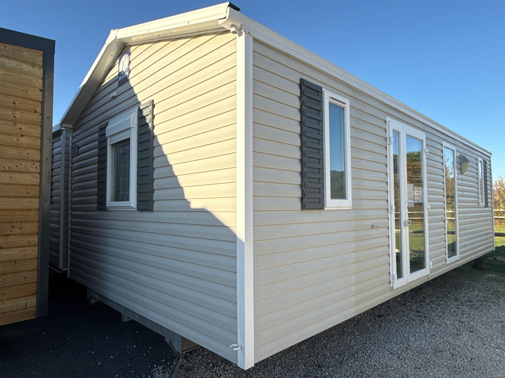 Mobil home d’occasion RIDOREV SANTA FE, d’année 2012, 8x4m soit 32m², 2 chambres, toit double pentes tuilé, bardage PVC et double vitrage.