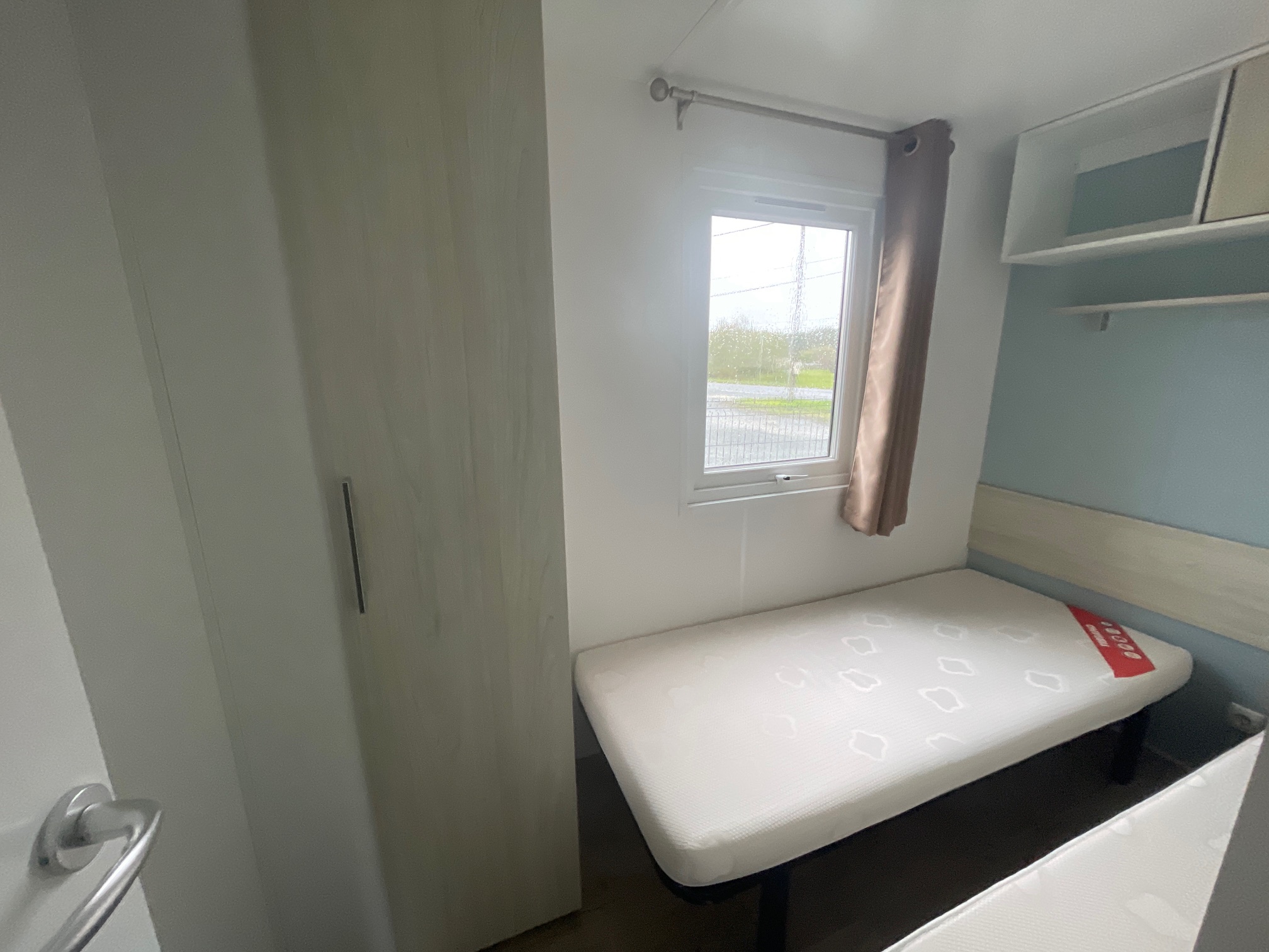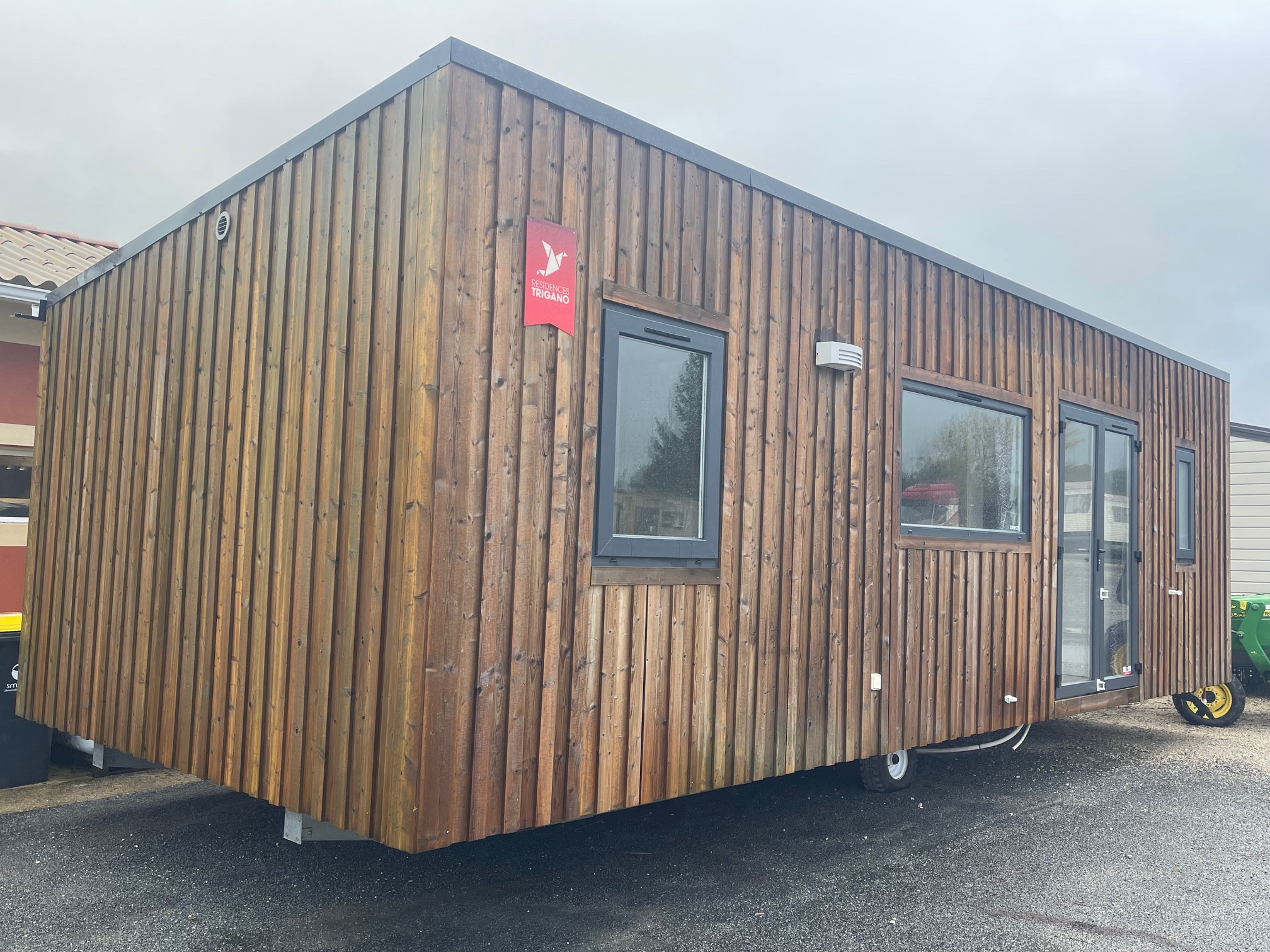 Mobil home d’occasion TRIGANO EVO 35, d’année 2018, toit mono pente tuilé, bardage BOIS, double vitrage, 9x4m soit 36m² et 3 chambres.
