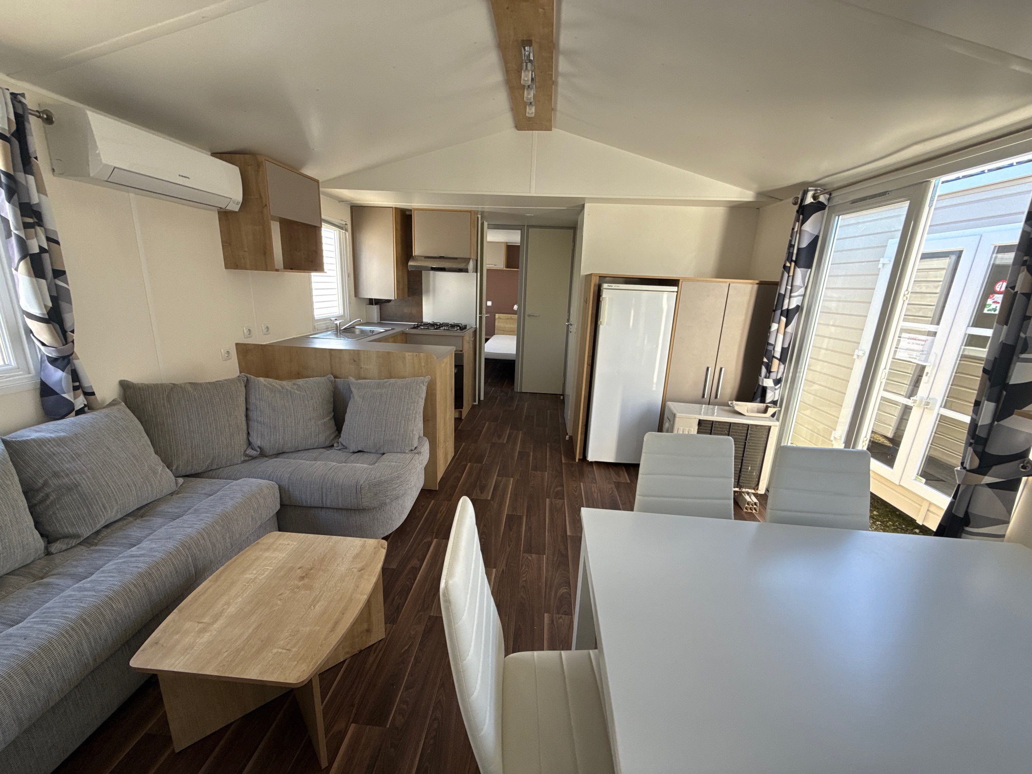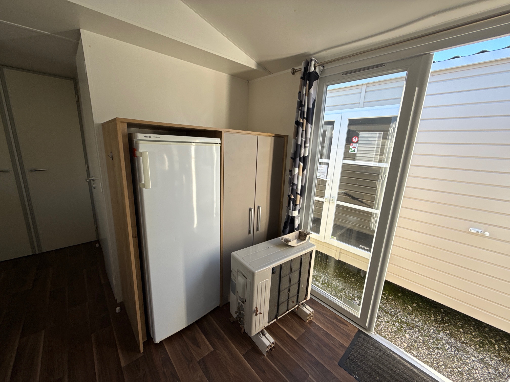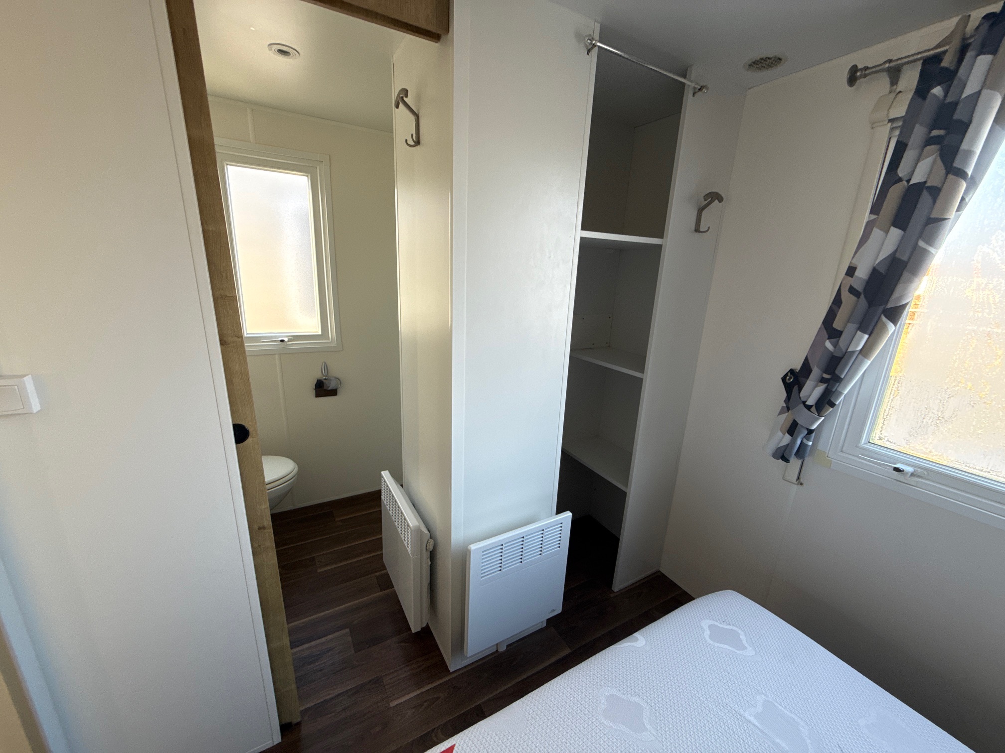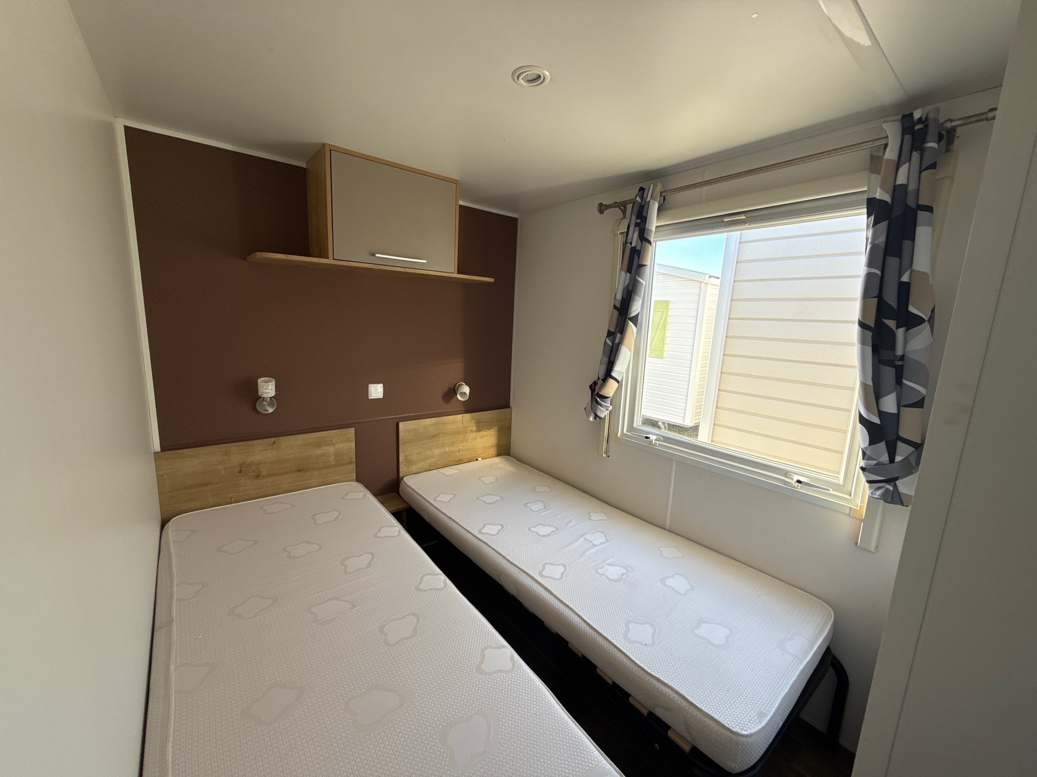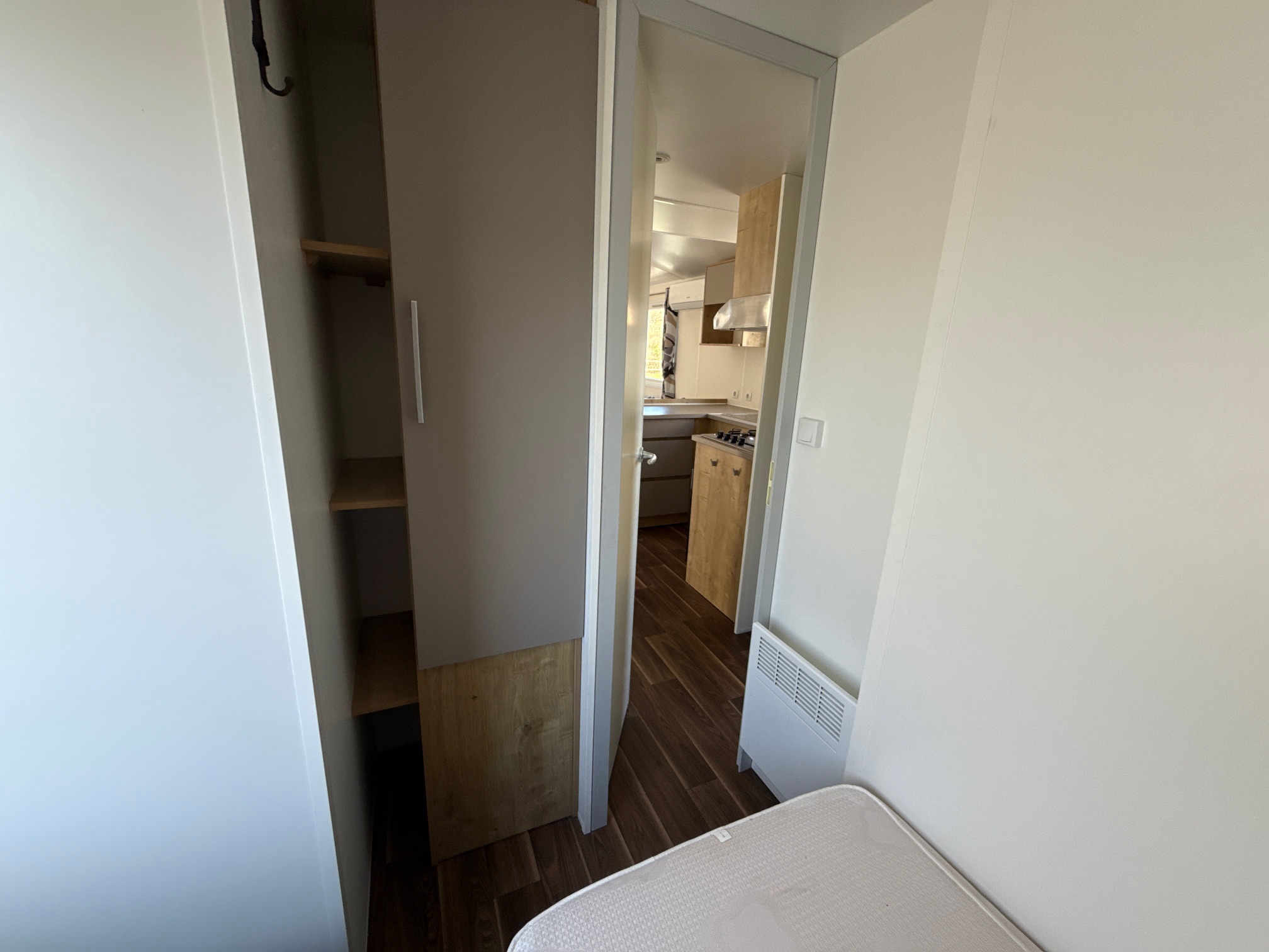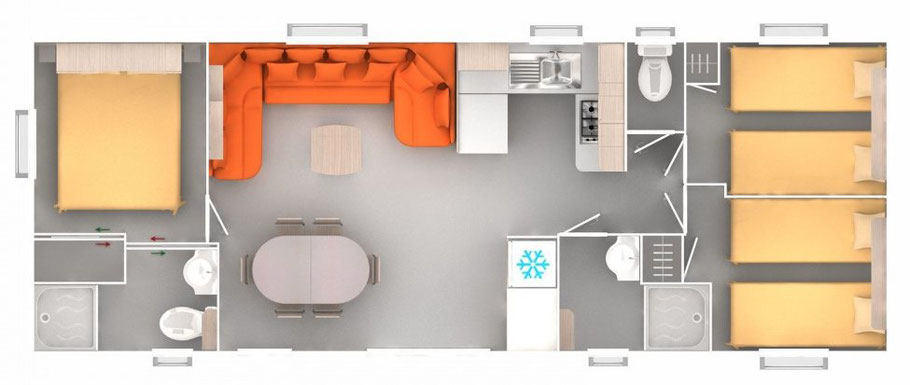 Ce mobil home d’occasion TRIGANO EVO 40, vous séduira par ses grandes dimensions, sa belle pièce de vie mais également par ses 3 chambres dont la chambre parents avec salle de bains privative.