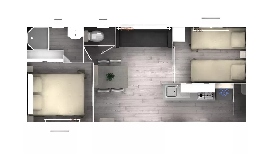 Ce mobil home d’occasion TRIGANO SUBLIMA, vous séduira par sa belle pièce de vie, ses dimensions idéales mais également par sa cuisine décalée et ses 2 chambres.
